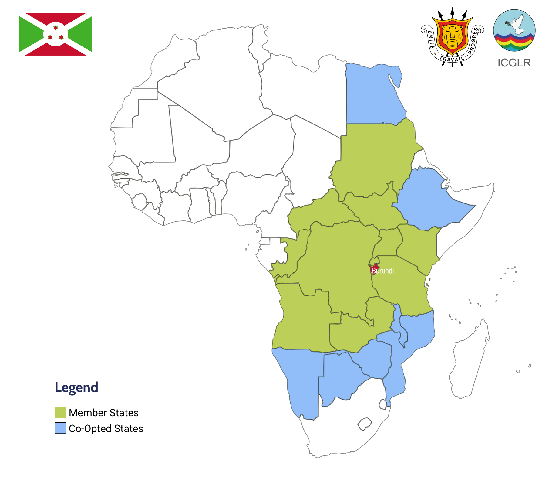 Burundi is a member state of the International Conference on the Great Lakes Region (ICGLR) and its headquarters are located in Bujumbura. The ICGLR is an intergovernmental organization focused on promoting peace, security, and development in the Great Lakes region of Africa.